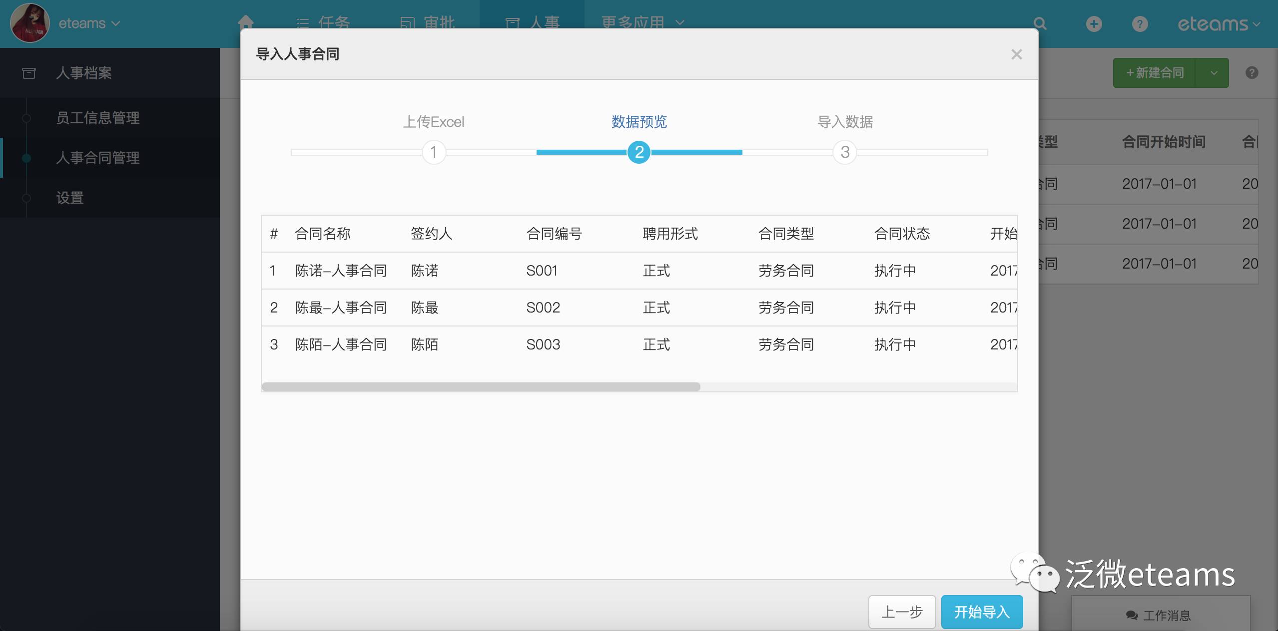 eteams系统中维护员工的人事合同,如果需要添加的同事较多,或者是之前已经在表单中整理过清单,那么现在可以通过【人事合同】中的批量导入功能,在模板中统一维护人事合同信息,一键上传即可成功。操作简单快捷,减轻了HR合同管理的烦恼。