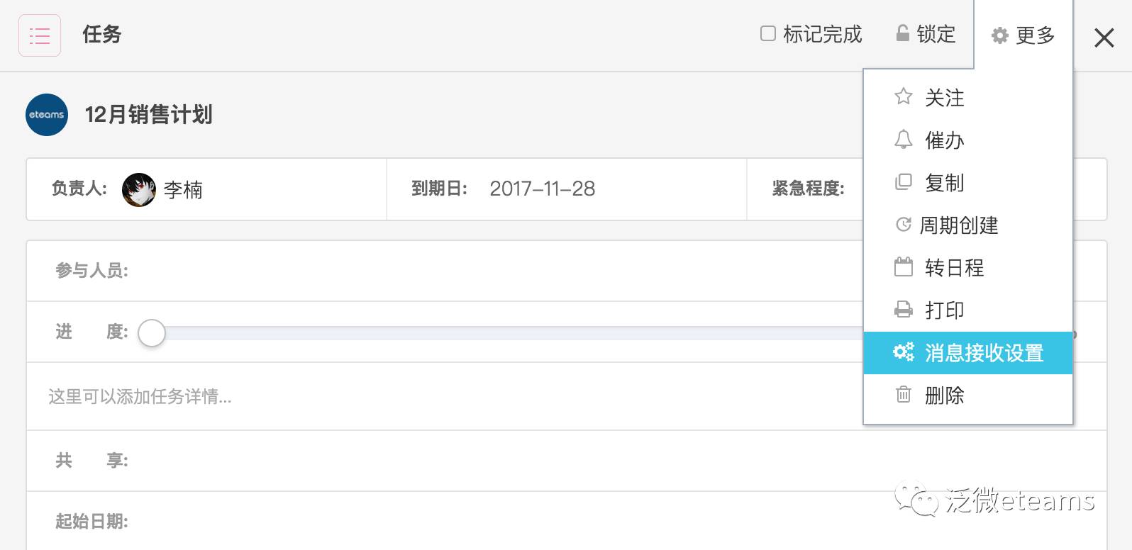针对这种情况我们升级了应用模块中的提醒机制,对于相关度不大优先级不高的事项可以开启【免打扰】功能,给自己一个更专注的办公空间。如何开启设置呢?我们以任务事项为例,在任务卡片更多设置里进入【消息接收设置】,开启【消息免打扰】。