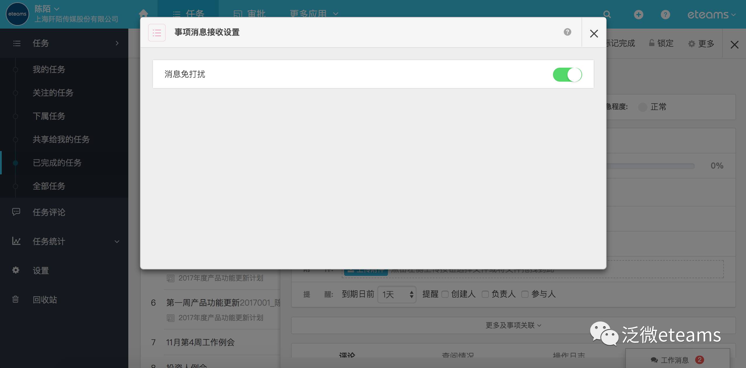 1、系统各个应用模块的事项支持设置消息免打扰功能,自定义事项的消息提醒,给自己更专注的办公空间,当然@的事项并不会受到影响哦~