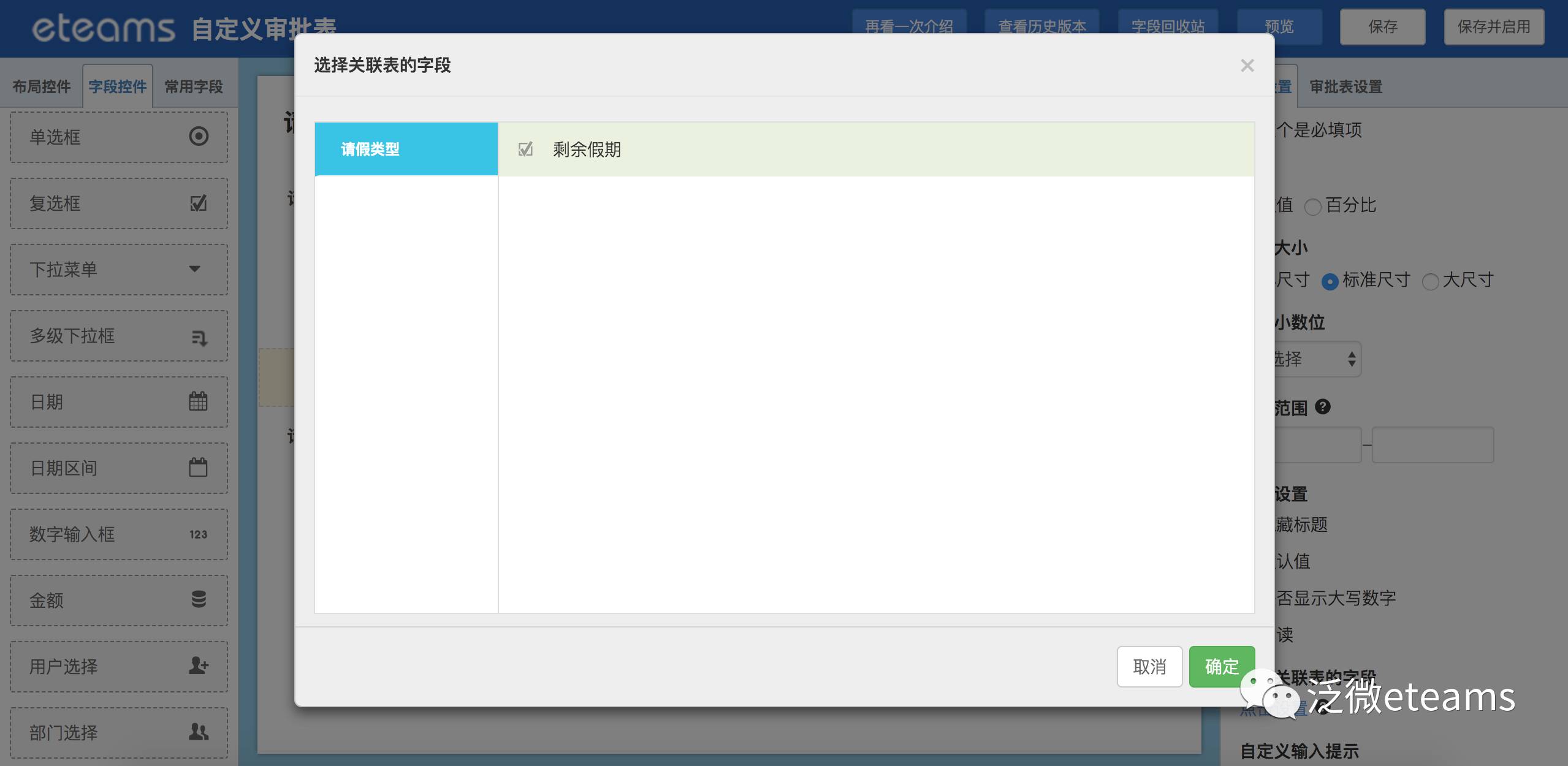 具体怎么设置呢?先设置数据源控件类型为【请假类型】,然后在表单设计中增加数字控件,并设置关联表字段为【剩余假期】,实现假期数据间的关联互通。