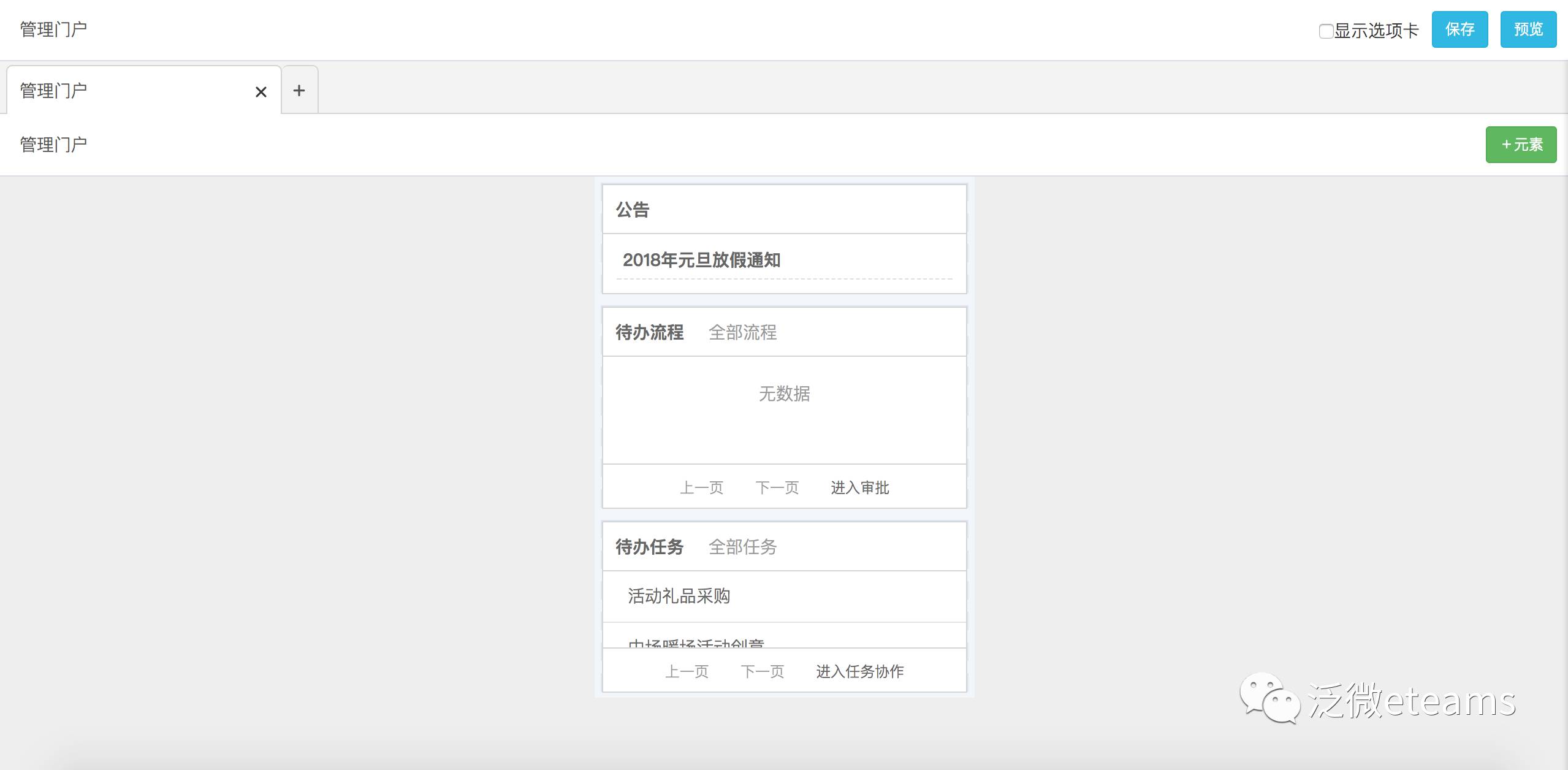 就像是我们的表单布局设计一样,可以任意地拖拽布局门户元素,并对具体的元素设置内容,如团队公告、工作流程、任务清单等等,所有相关的事项都可以设置快捷展示,让你的工作没有盲区!