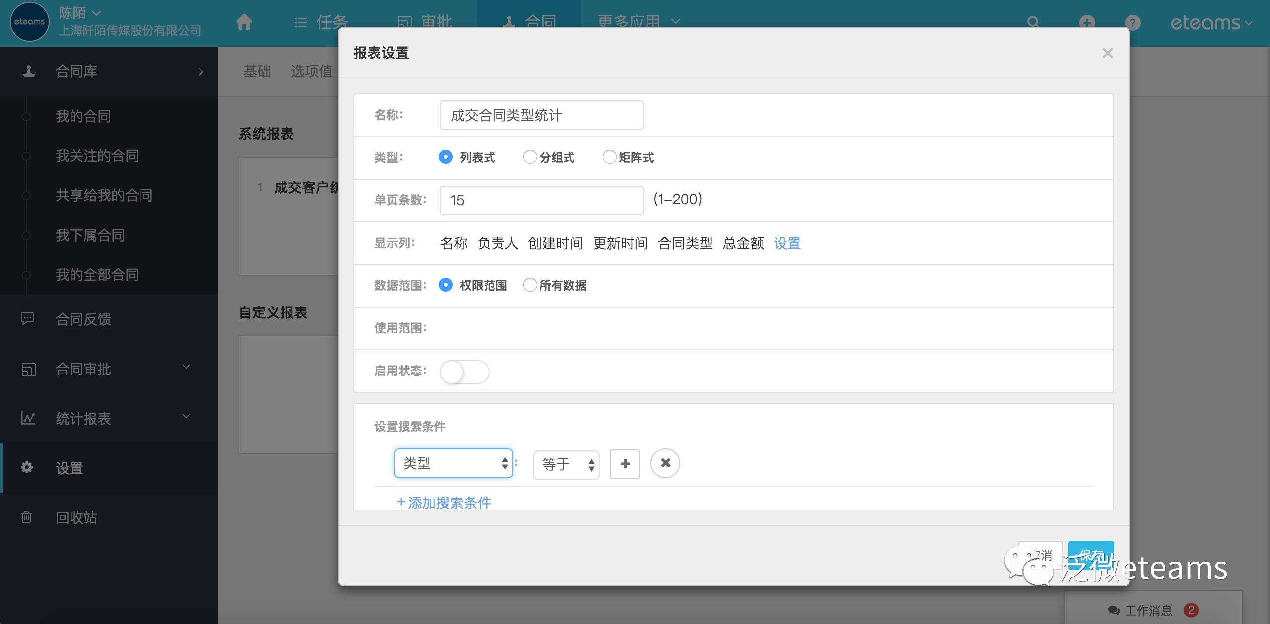 2、除了已有维度的合同统计外,我们新增了自定义统计报表功能,支持自定义统计的布局样式,统计的数据范围、显示设置、搜索条件,提供多维度的合同数据统计,让数据更清晰的同时,也能更全面地了解合同管理的情况。