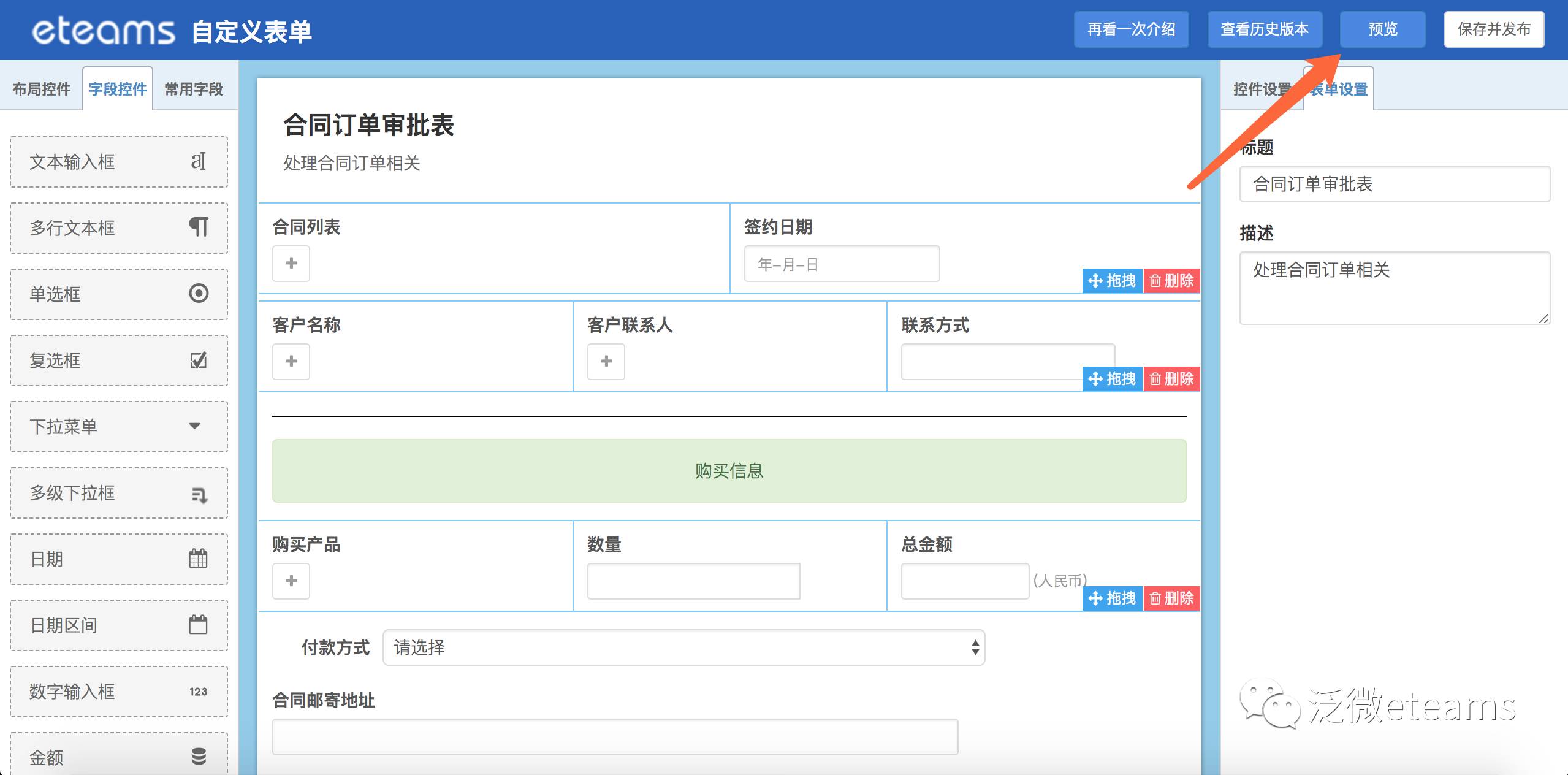 具体怎么切换呢?我们以【合同订单审批表】为例,在编辑页面点击右上角进入到实时预览页面。