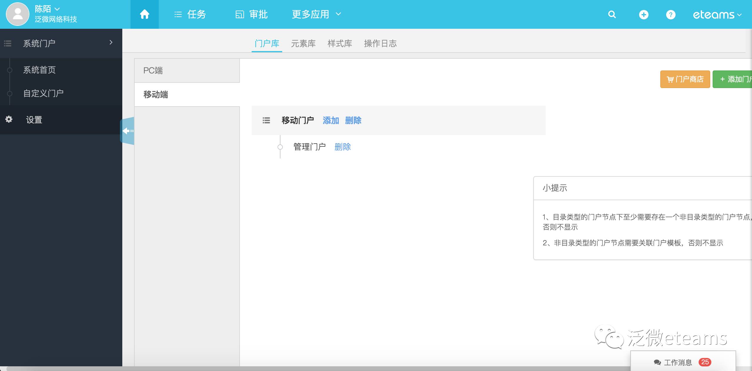 eteams系统门户聚合统计所有团队工作中的重要提醒与事项,自定义构建专属快捷的门户中心!除了PC端外,移动门户也正式上线啦,在手机web端上也可以体验全新的门户功能,快捷查看并进入到具体的工作事项中。