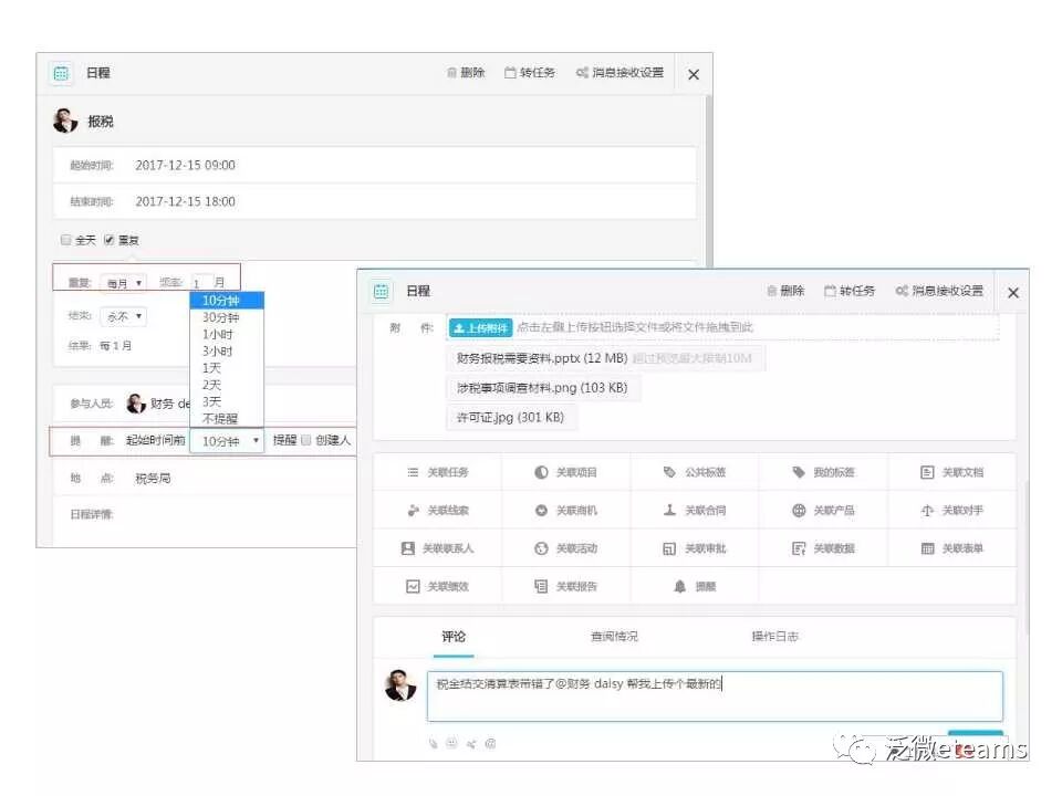 使用eteams之后,财务这样解决日程安排问题:通过eteams「日程」安排重复日程,设置提醒,时间到了,小e会提醒我!通过“事项关联”将所有需要资料关联和通过附件上传,资料没带全,小e会调给我!没有压力还从不出错,就是这么简单!