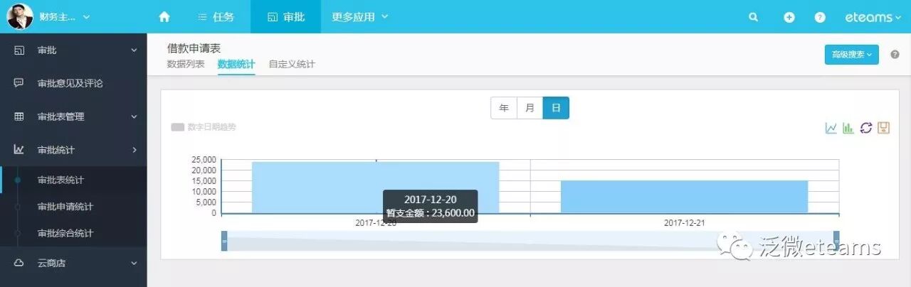 使用eteams之后,财务这样解决报表问题:会计通过「审批统计」直接获得准确数据,减少人为失误,例如:打开《借款申请表》可以看系统自动汇集的所有借款数据,利用“数据统计”即可得到每日、每月、每年的汇总金额,方便财务报表的制作;