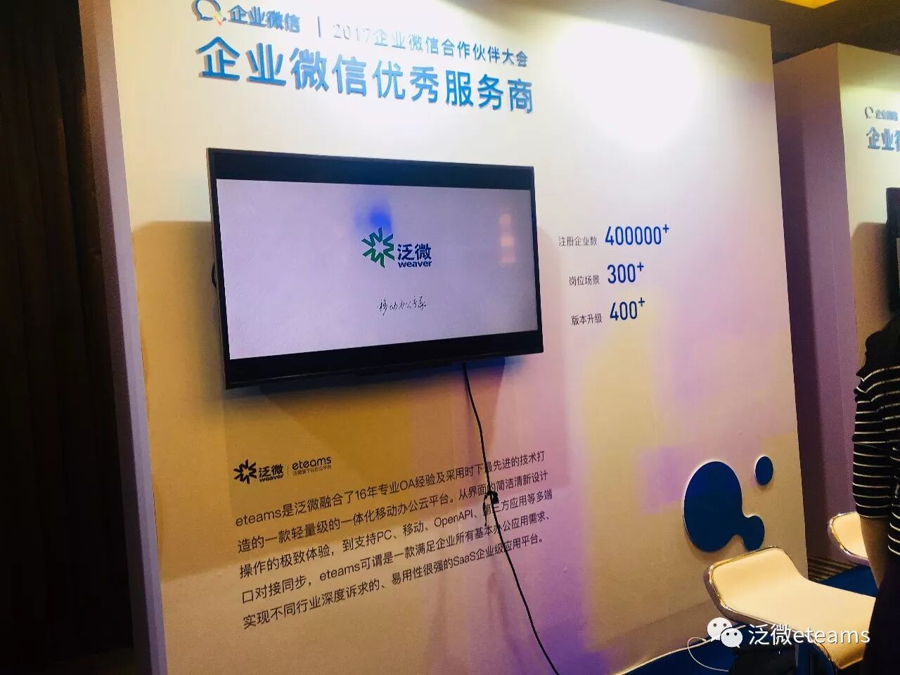 今日,泛微eteams受邀参加在北京召开的“2017企业微信合作伙伴大会”。此次大会企业微信将用开放的力量,帮助企业打造更加便捷的移动办公平台。泛微eteams与国内互联网巨头腾讯公司在平台和内容方面达成战略合作,实现优势共享、互利共赢。