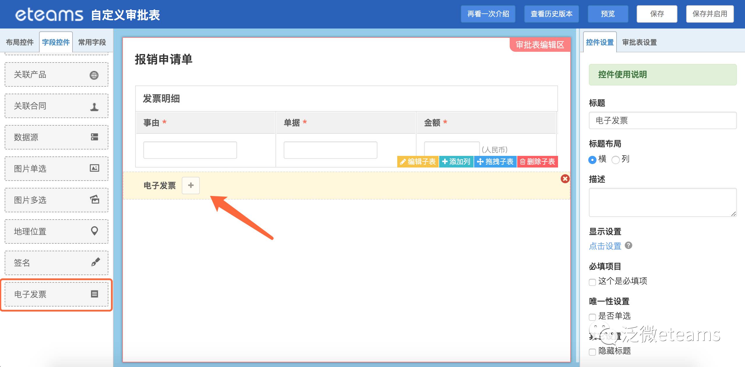 1、审批表新增【电子发票】控件,发起费用报销申请,自动关联微信电子发票,报销过程简单了,财务审核也更轻松;