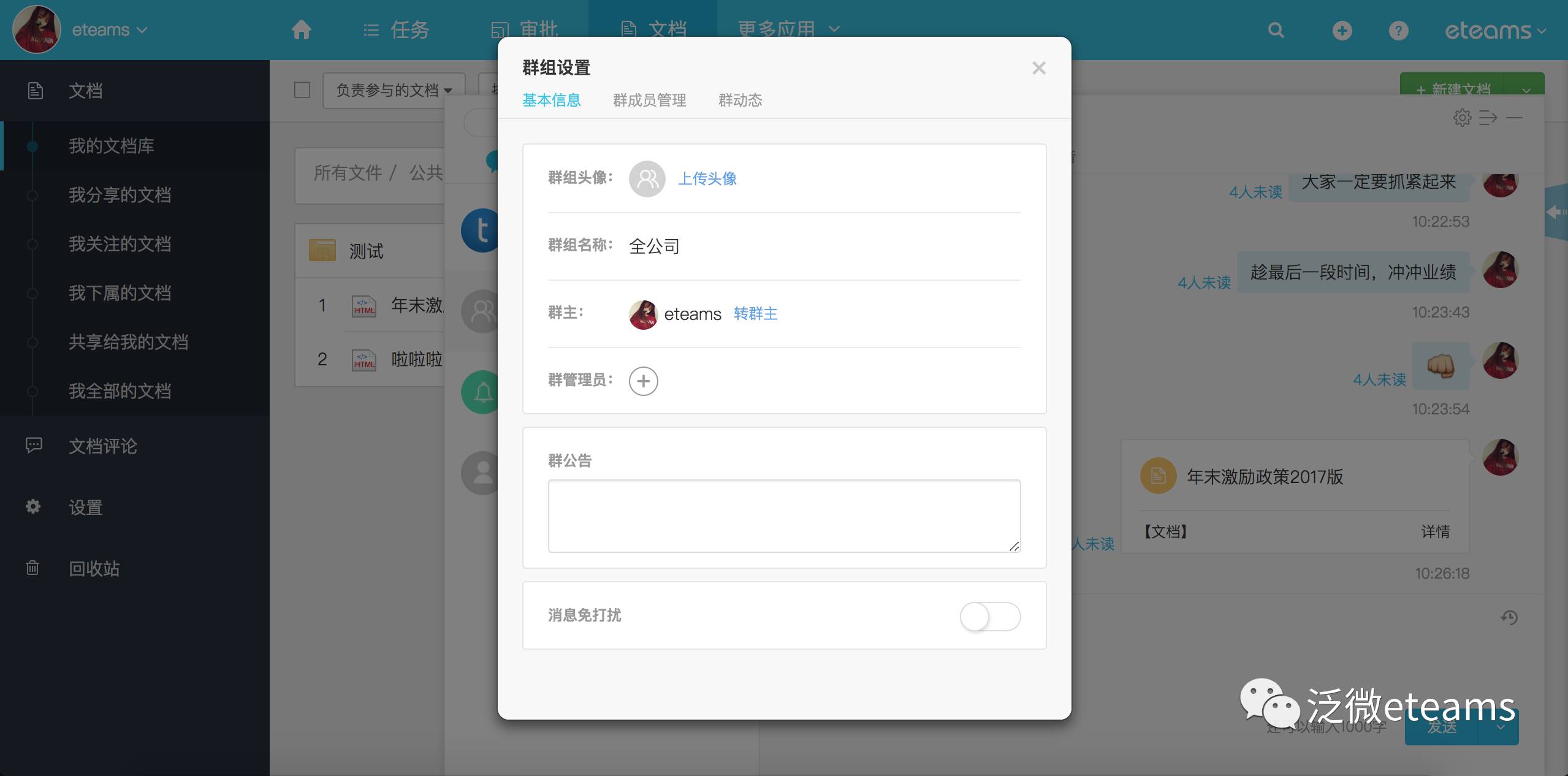 3、eteams IM群组设置功能大升级,新增群头像更改、群主管理员设置、公告设置、成员管理、群组动态等多重实用功能,群组管理更规范啦~