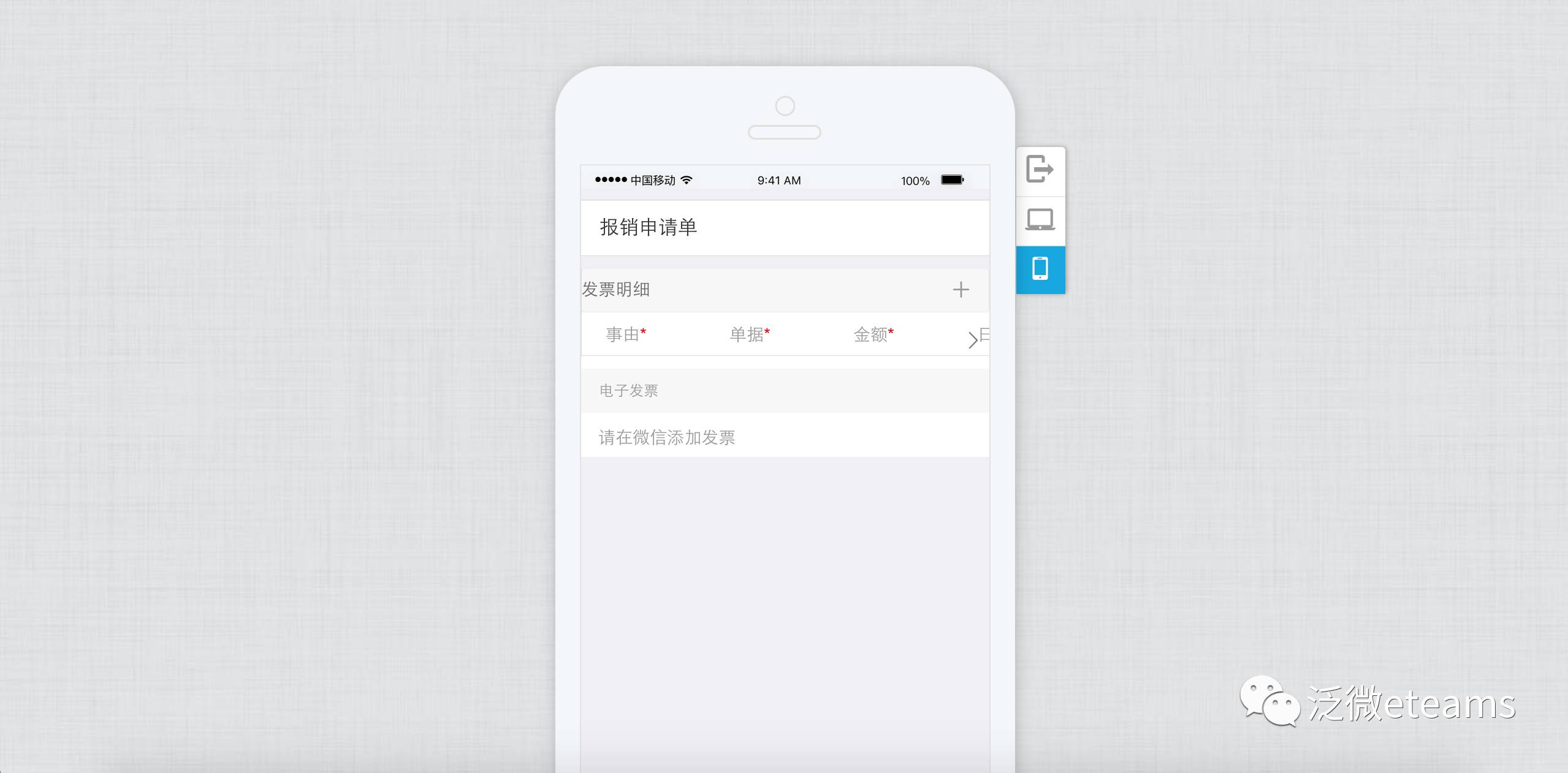 如何操作呢?在审批自定义表单页面新增【电子表单】控件,这样当我们在移动端(微信服务号、企业号、企业微信)中发起审批时,即可勾选微信电子发票信息。