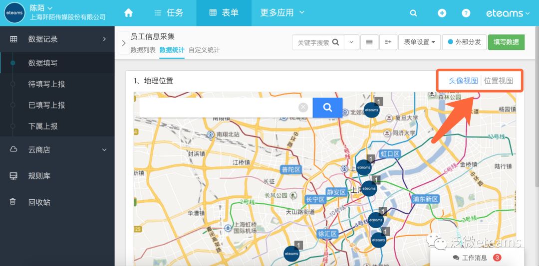 2、使用表单定位控件搜集的信息也支持统计啦,在地图中可以切换多视图查看。例如《员工住址采集》,所有位置信息在地图中一目了解;