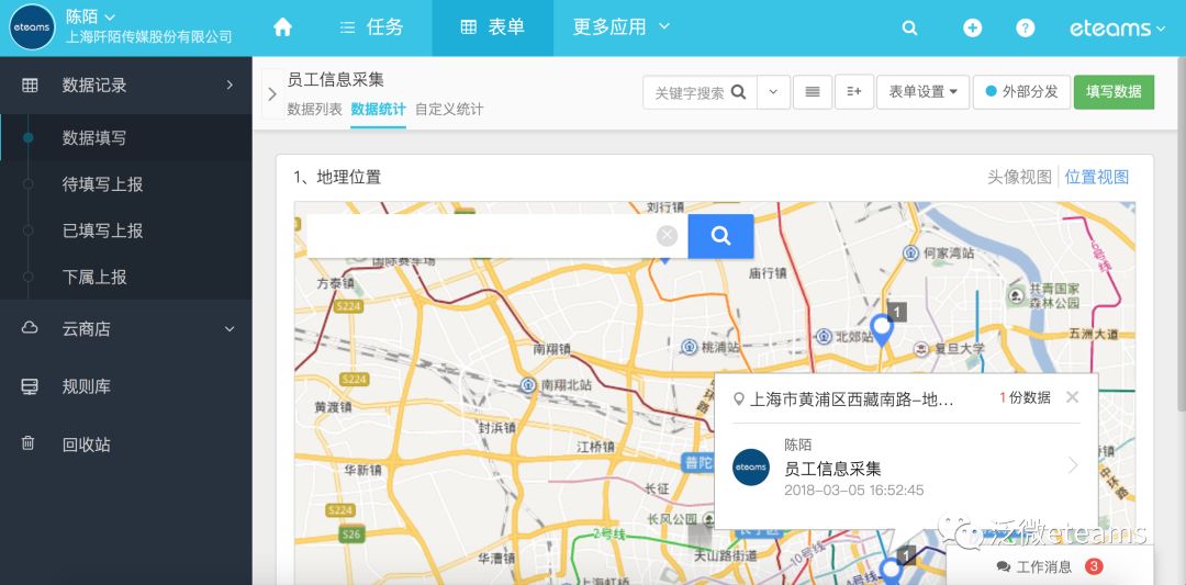 表单数据统计现也支持统计定位信息啦,当表单中使用了定位控件,在统计视图下,所有搜集到的定位信息会整合在地图中进行展示,点击具体的定位信息还可以查看详细的表单数据内容。