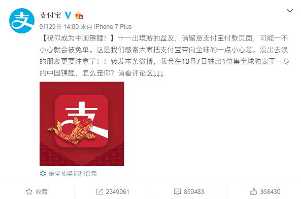 国庆期间,300W人中,被支付宝抽中,集全球独宠于一身的中国锦鲤成功刷屏。现在打开朋友圈,不转个锦鲤,甚至都有点错过一个亿的幻觉。