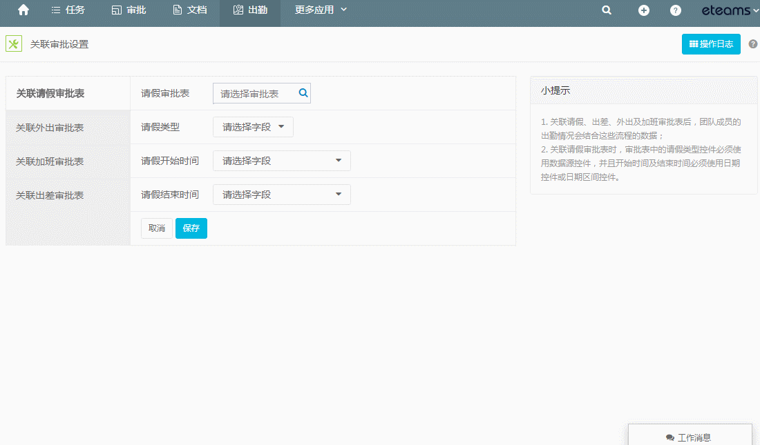 但是在eteams中,人事姐姐只需要事先在“关联审批设置”中设置好关联的请假审批表、出差审批表等有关的考勤审批表,日后,只要员工发起相关的审批,都会自动汇总到个人的考勤数据中,完全规避了一对一的个人出勤数据审核,大量简化了人事的工作负担,又避免了人为统计的错误。是各企业人事小姐姐的第一下助手~