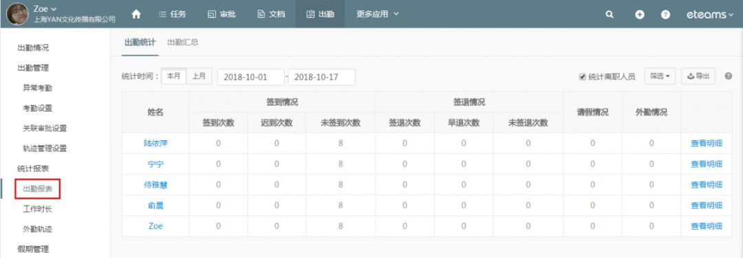 在eteams中,员工考勤告别容易出错的打卡机,通过手机GPS方式,精准打卡。而打卡数据,结合请假情况、外勤情况,数据一并自动汇总到系统中,通过“出勤报表”一目了然整个团队的出勤明细。避免人工误差的同时,有效的减少了人事的工作负担,提高了考勤事项的执行效率。人事小姐姐再也不用担心月底的时候手忙脚乱的考勤数据汇总核对~