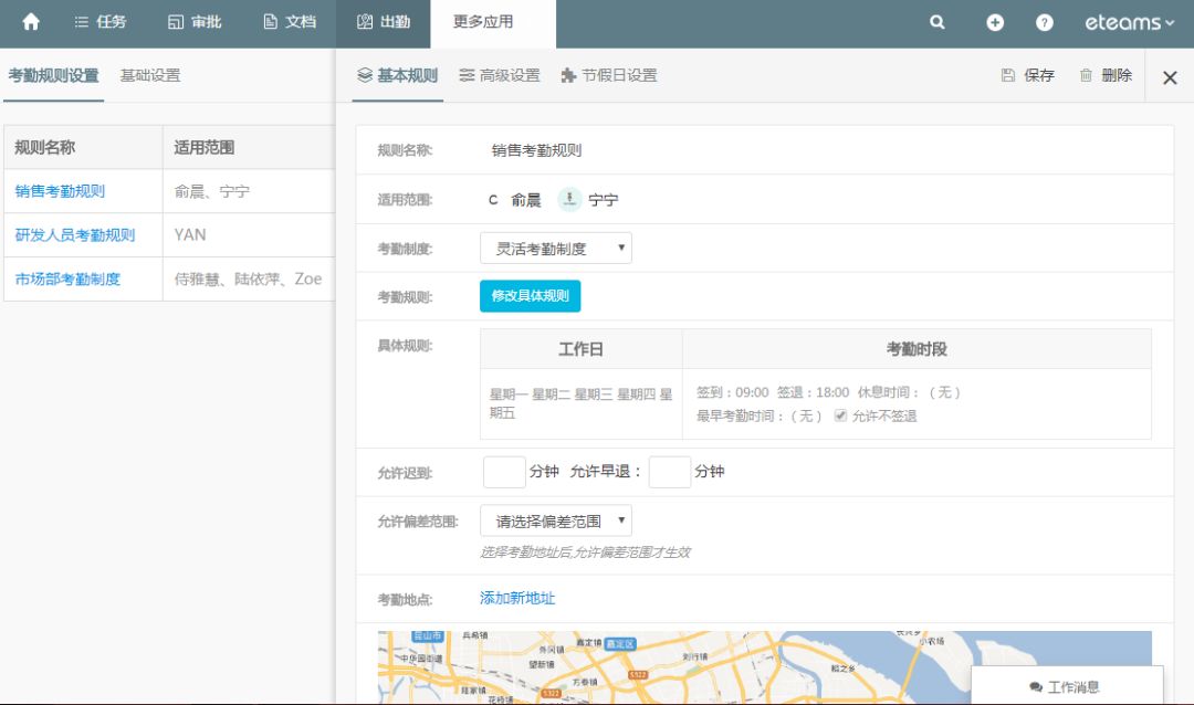 在eteams中,我们可以通过为特定岗位人群、或者特定的团队设立特定的考勤规则,只需要通过出勤——考勤设置——新建规则,即可为专门的人群建立专门的考勤管理规则。