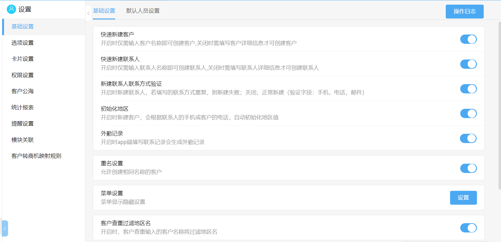 选项值、客户卡片、客户公海、字段权限、统计报表、联系提醒、纪念日提醒,模块关联、和页面编辑等。