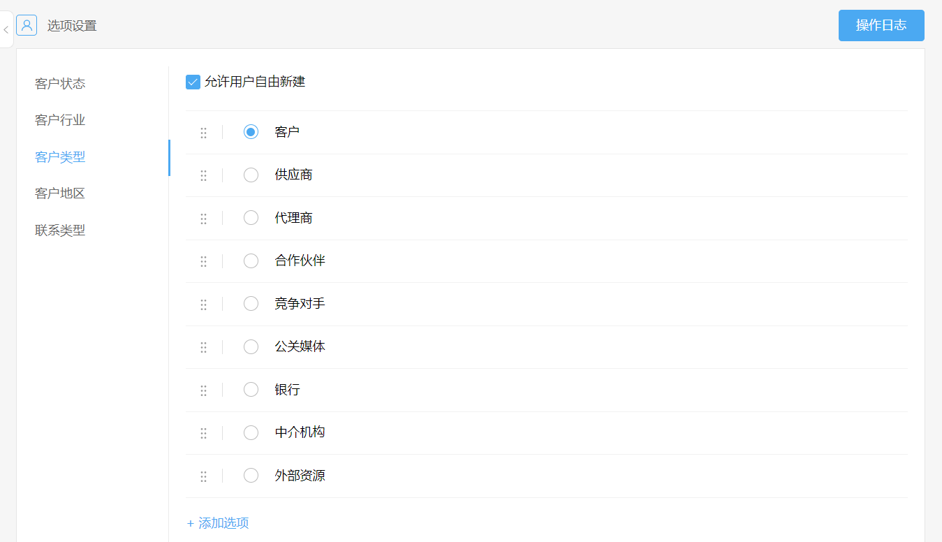 包括客户状态、客户行业、客户类型、客户地区和联系类型的权限、国际化,还可以在客户类型上设置自定义字段。