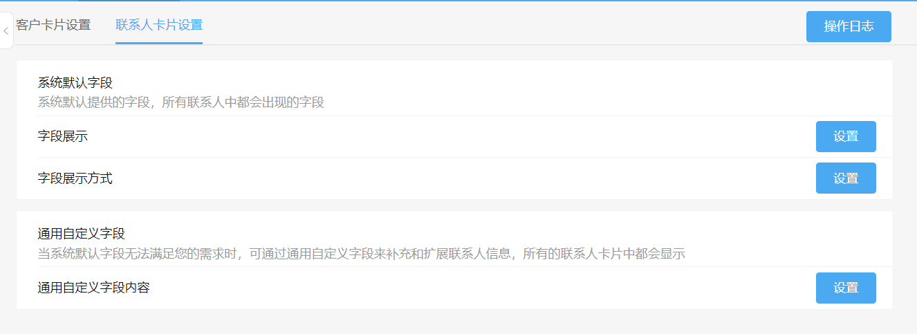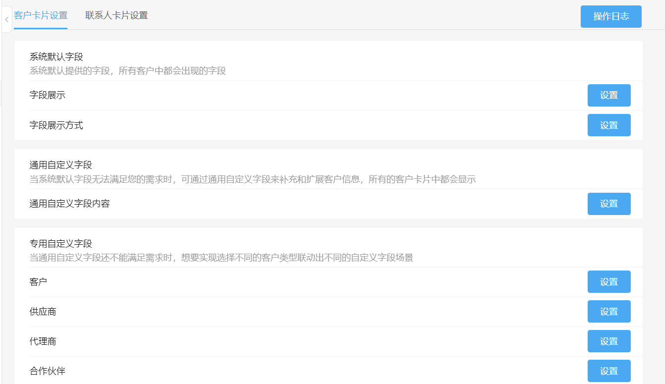 设置客户卡片字段和展现方式,支持按客户类型进行设置自定义字段和展现方式,客户联系记录自定义字段和联系记录显示设置。