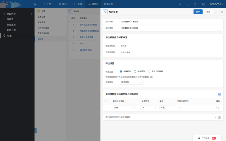 你以为所有表单搭建完成之后就没了,不不,还差最后一步。将所有数据关联起来,怎么做,就是规则库啦啦啦~其实没有那么复杂,领用就会减少库存,入库就会增加库存~当然,规则设置好了也不是凭空就会触发,还需要分别对领用和入库表单设置触发规则。一般是提交确认后,会进行相应的减少、增加库存