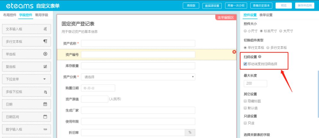 在“业务表单”中自定义搭建固定资产登记表,勾选【扫码设置】后,在移动端打开表单后,会自动提取产品的二维码/条形码信息填入该字段,录入后的资产数据管理员可以随时查看、编辑和修改。