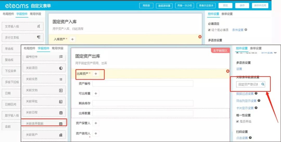 在“审批”中自定义搭建固定资产出库/入库表,添加【关联表单数据】控件关联固定资产登记表。资产出/入库随时在线申请,具体使用和入库情况均予以记录。