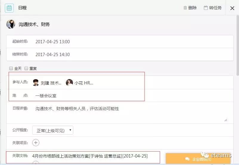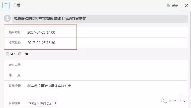 解决办法是:在接到活动方案任务的第一时间将该任务部署到泛微eteams的日程模块中,设定好日程的开始和结束时间,告诉自己Deadline呼啸而去,现在就需要安排好开始时间。需要注意的是:给自己少留点时间,任务的结束时间尽量早于Deadline,给中途出现的意外留下处理时间。