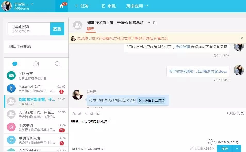 做好计划后,消除干扰很重要,可以关掉社交工具,使用eteams这样的一体化办公软件平台进行工作上的沟通,一鼓作气的完成工作,避免因为外界打扰造成的重新捋顺工作。
