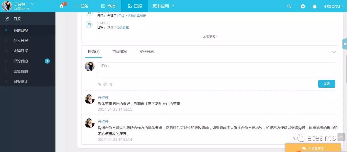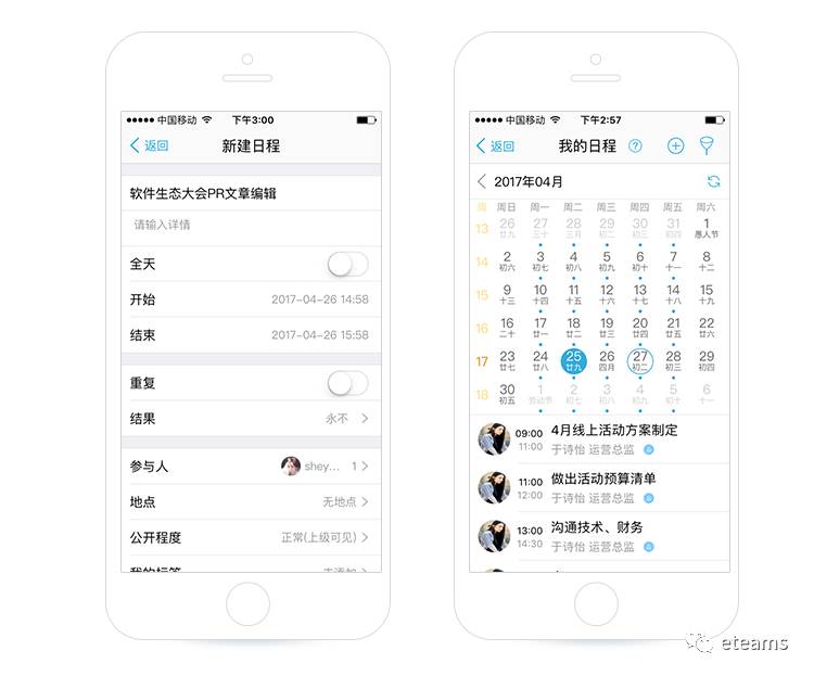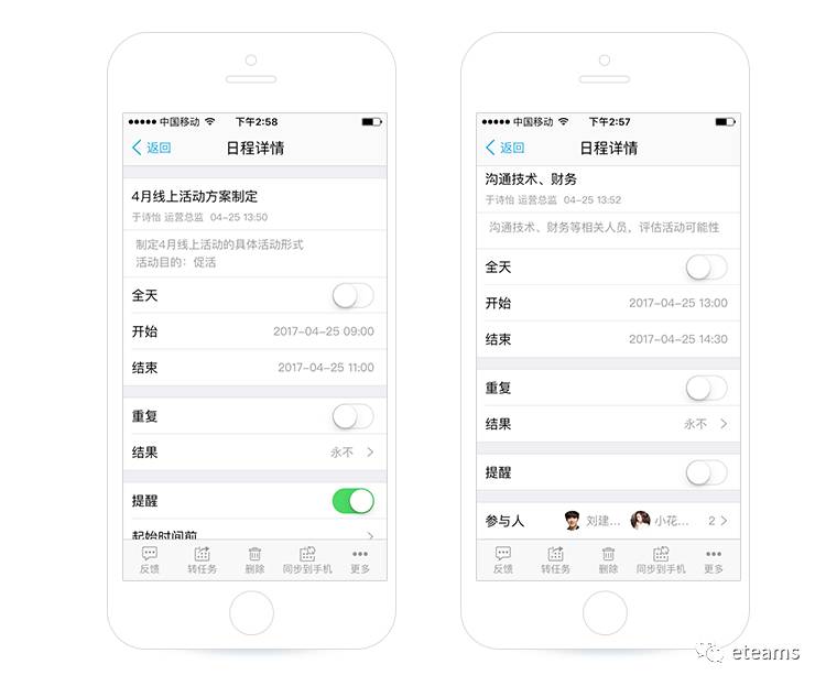 这时候eteams的移动办公特性可以为您带来很大的便利,你可以在等车的十分钟里规划处理好明天的工作日程像上述情况一样将明天需要做的事情细化具体化,让明天工作更快进入状态。