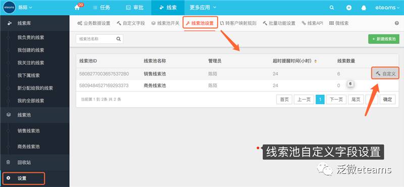 为了满足不同公司对于线索的管理,线索已经支持了通用的自定义字段功能,现在在这个基础上,针对不同的线索池也可以设置个性化的字段。例如针对供应商的线索池,可以添加一些供应商规模、主营状况等等信息。如何设置呢?我们在线索模块的设置里,进入到线索池设置,将鼠标放置在线索池页面上,即可点击右侧自定义进入到自定义界面。