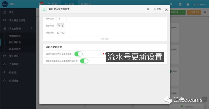 除此之外,审批退回后重新提交也是一个常见的场景,这个时候是否需要变更相应的流水号,例如流失日期想要根据再提交时间显示等等,也可以在设置里开启。