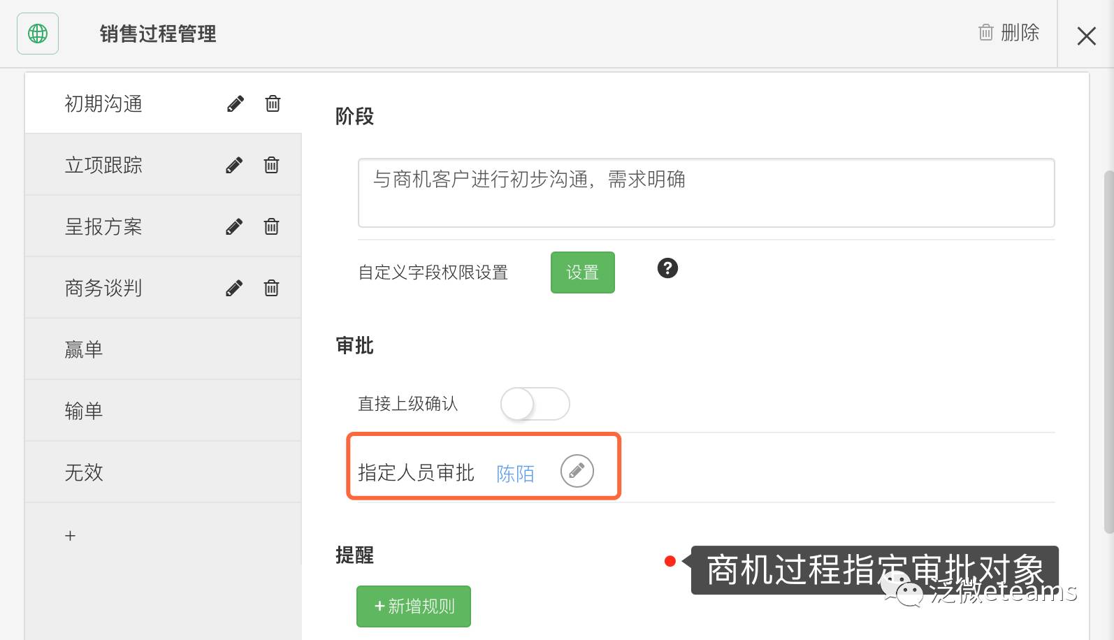 现在我们可以在销售过程中设置指定专人审批,商机推进流程更规范化。当然,设置了专人后,直接上级确认则无法选择。