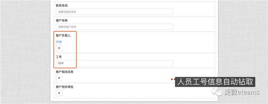 现在,我们的数据钻取功能更加强大,新增支持任务、审批自定义字段以及人员信息关联控件的钻取。以人员信息管理控件钻取举例,表单中添加了人员控件,当我们需要在选择某一成员时同时显示该成员的手机信息,则我们可以添加手机控件并设置该字段与人员控件中的手机信息关联,其它包括工号、邮箱等信息亦是如此,十分便捷。