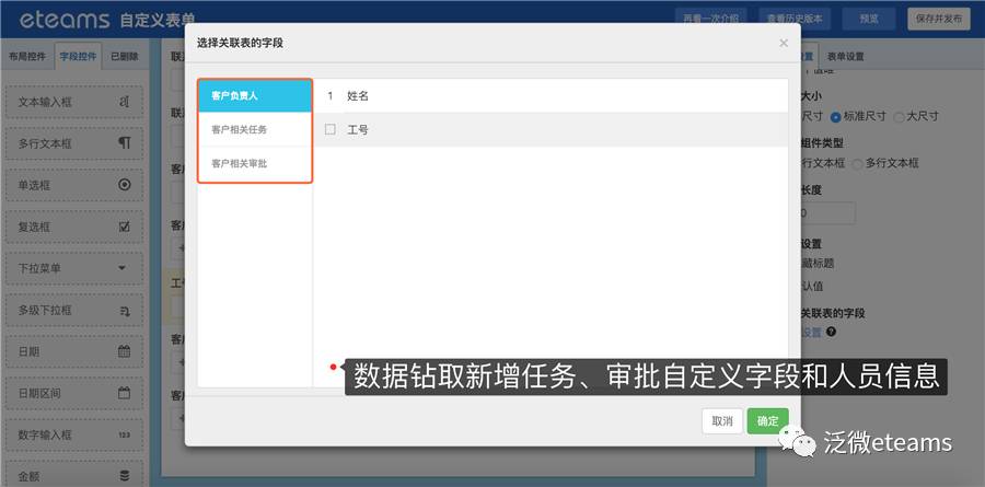 之前我们已经介绍过表单的数据钻取功能,在自定义表单中,当表单中包含关联控件时,可以设置与该关联控件的字段关联,实现数据的钻取同步,提高数据维护的便捷性和准确性。详细的数据钻取功能可以参看我们之前的文章-eteams0110更新。