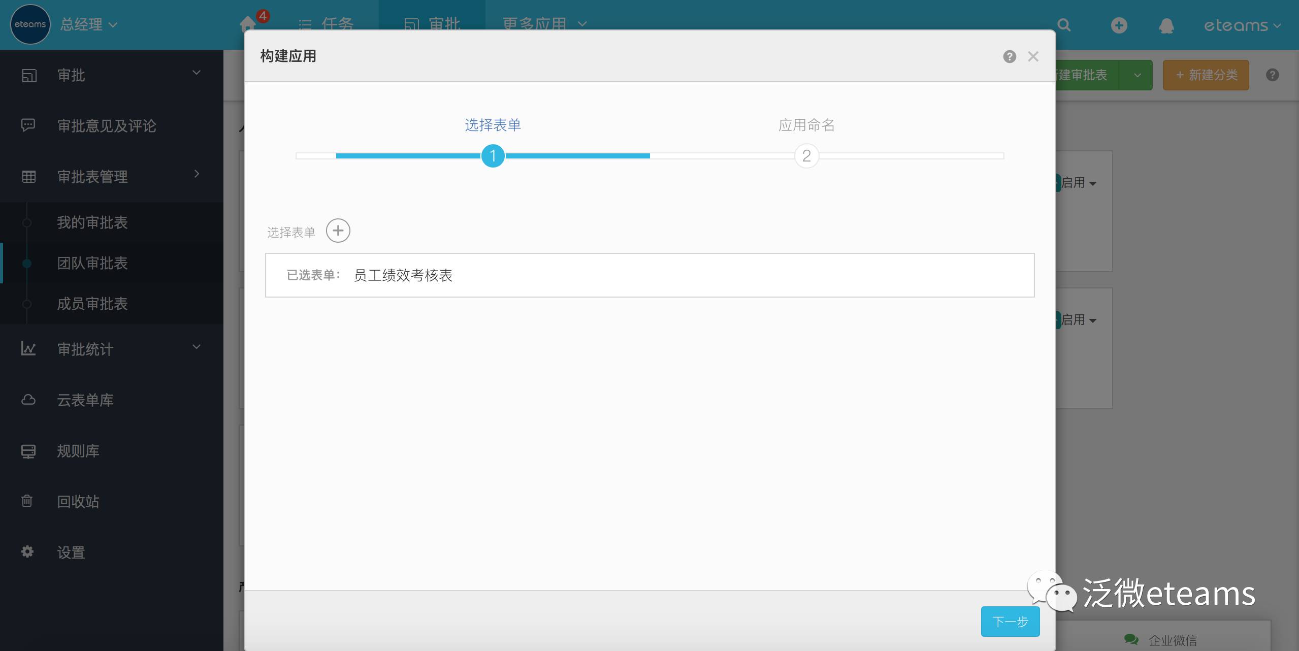 员工绩效考评表搭建完成后,我们通过一键形成应用进行高效管理。具体的操作步骤为在表单中选择【构建应用】并逐步配置应用信息,即可生成个性化应用,拥有与系统基本应用一致的使用体验。
