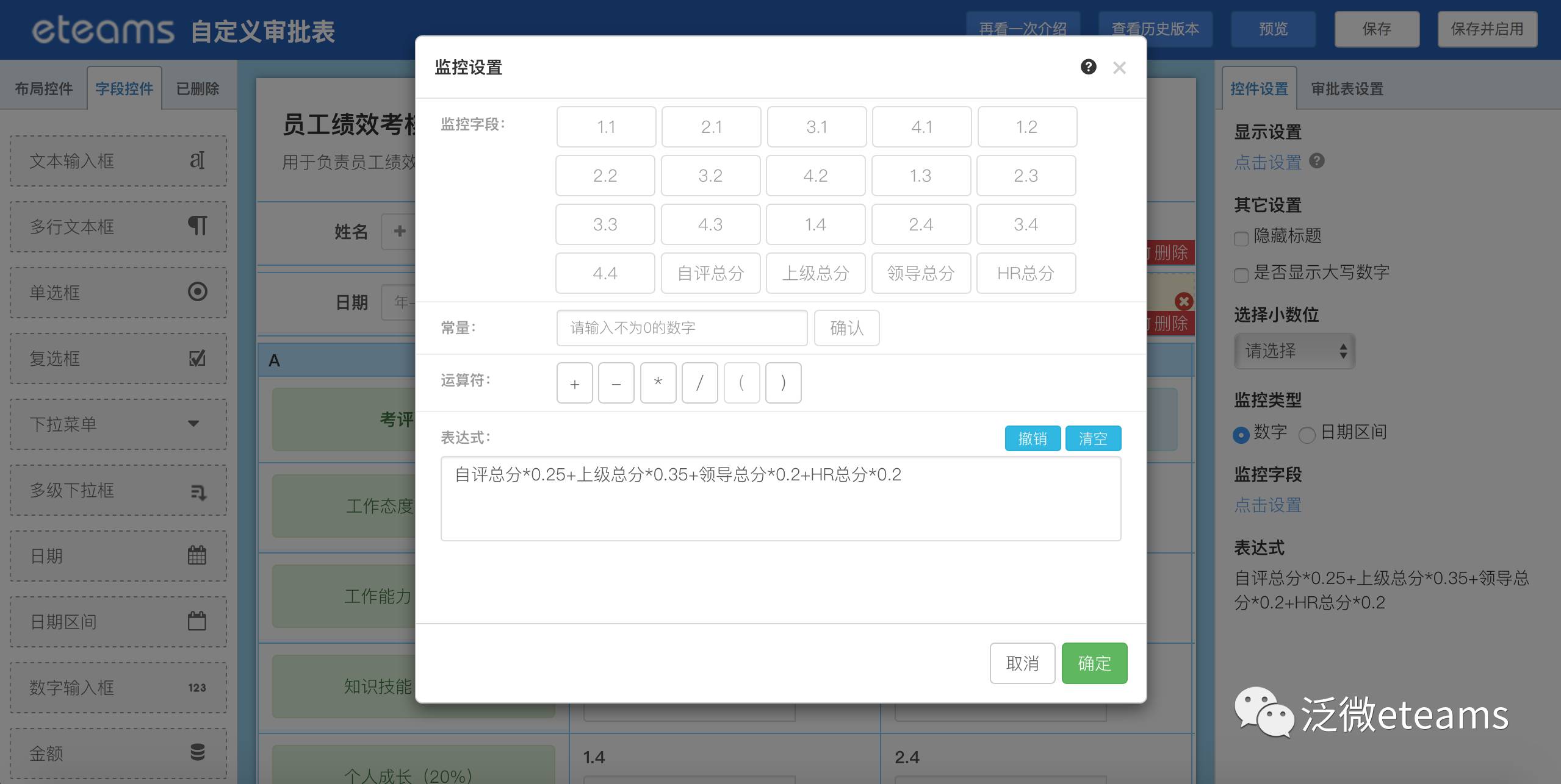 明确了整体的考评流程,我们可以快速通过自定义表单功能将整个《员工绩效考评表》在线化,在表单中完善详细的考评内容部分,这里有几点说明