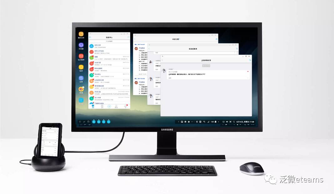 三星和泛微eteams合作,eteams适配Galaxy S8,完全支持用三星Galaxy S8使用eteams移动办公无缝体验。只需通过HDMI连接线将手机与显示器、键盘和鼠标连接上,就能够像在台式机一样使用eteams,甚至三星运用的虚拟桌面基础架构无缝转换到显示屏上,同时保持高保真度,更可随意拖拽、重叠、实时同步操作让移动办公体验更佳。