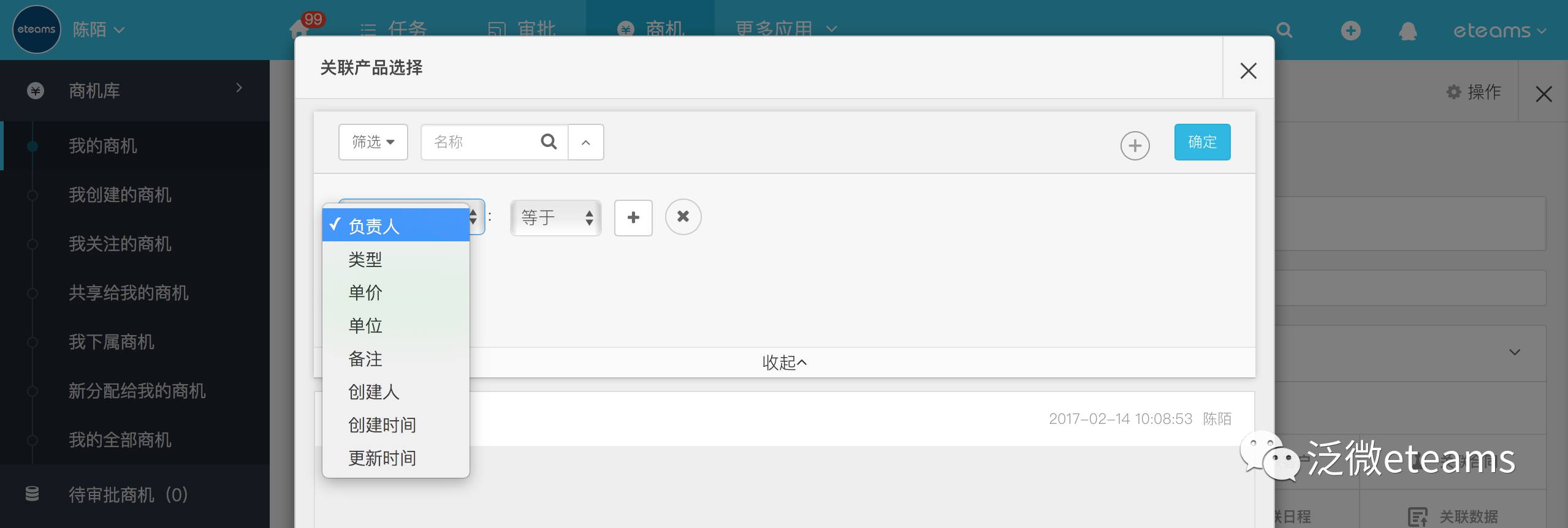 3、【事项关联】中的【关联产品】功能支持高级搜索啦,以一个商机事项为例,我们可以设置该商机的关联产品,在搜索具体的关联产品时,可以按负责人、类型等多种条件进行精准搜索,搜索更高效~