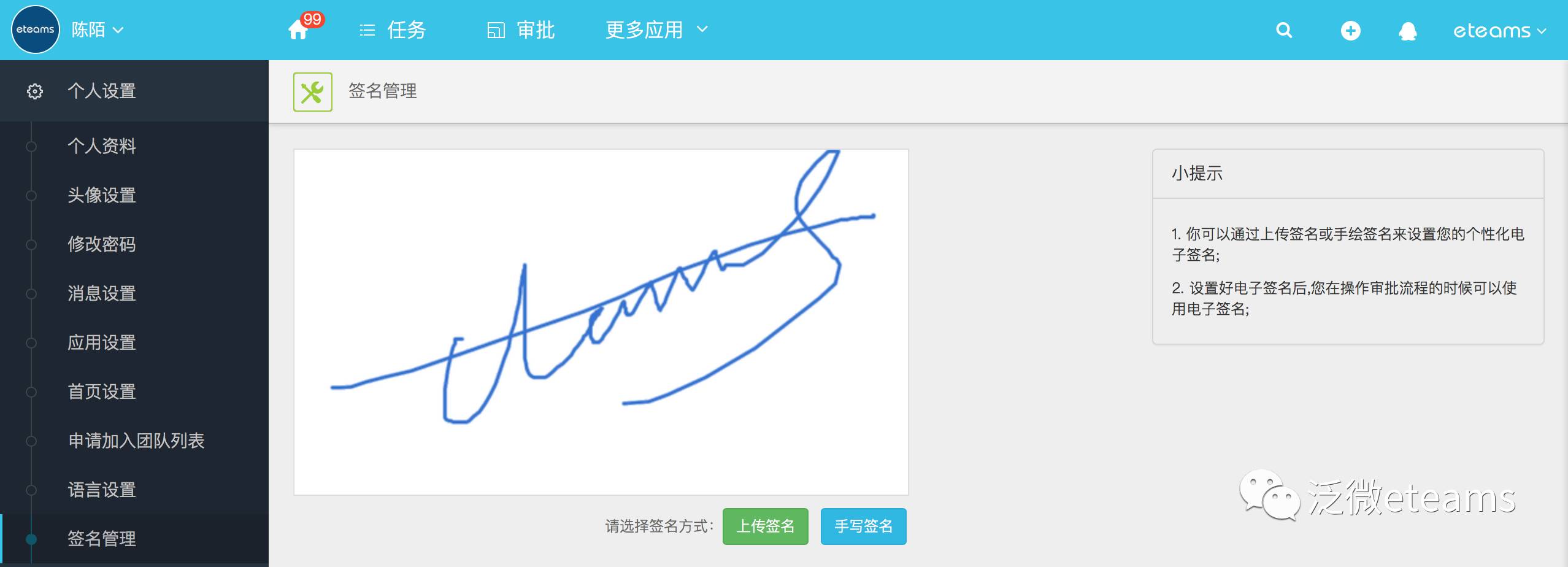 因此我们推出了签名管理功能,在【个人设置】里可以将个人电子签名保存为电子版,在审批处理时直接方便地取用。