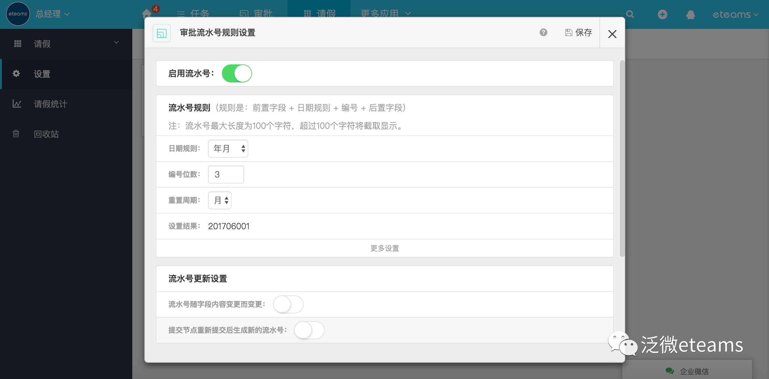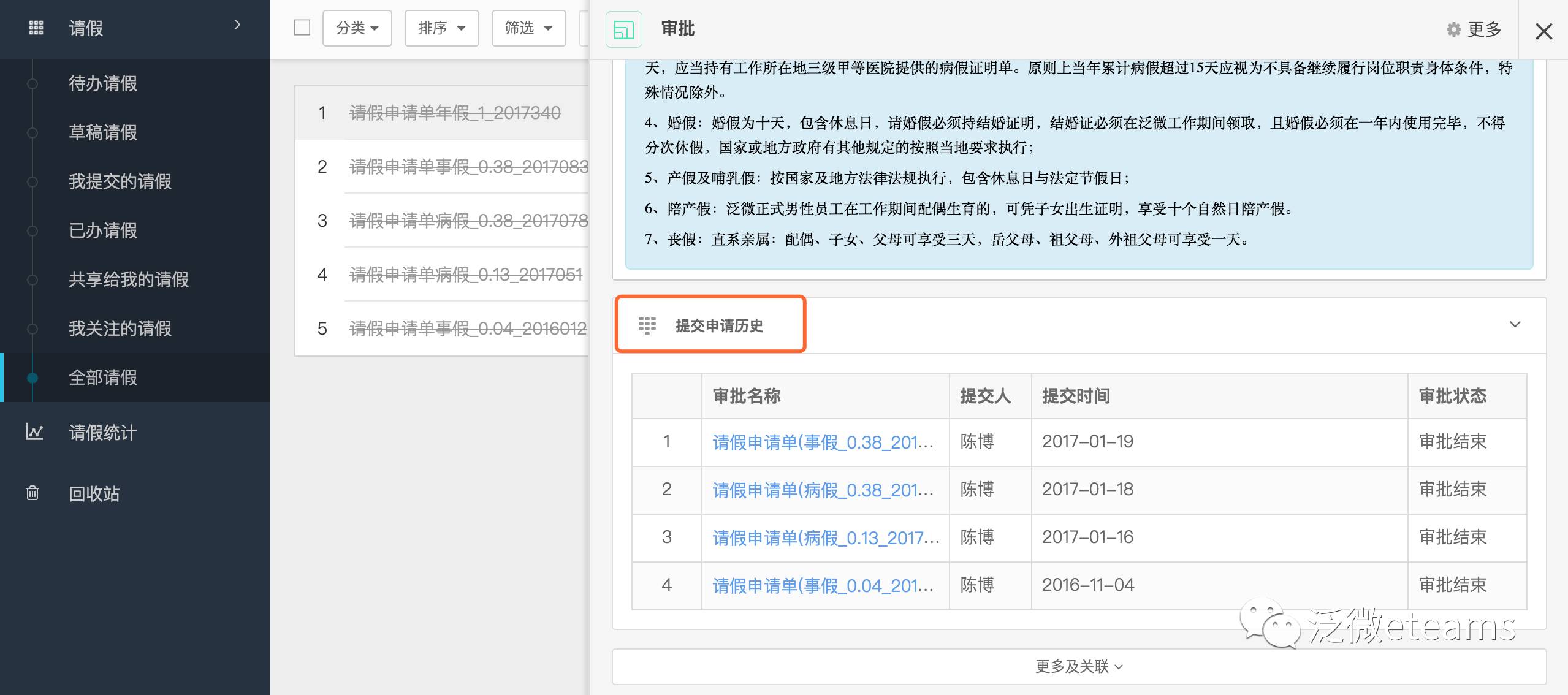 • 开启审批流水号功能及审批历史申请功能,便于管理请假申请信息,并能够直观地看到历史的请假数据