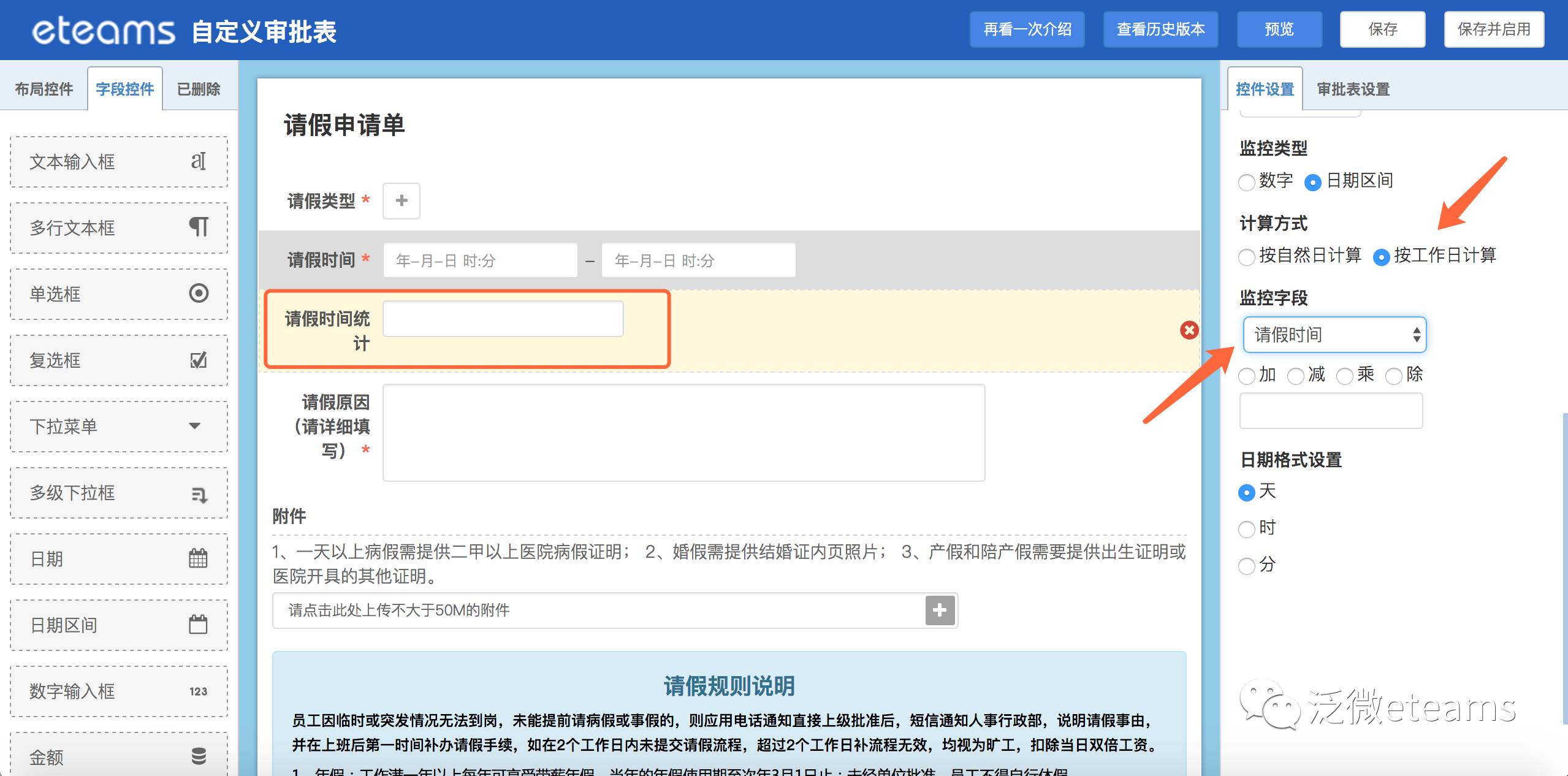 • 请假时间可以通过运算控件自动生成,计算一般按照工作日计算,即不统计非工作的请假时间