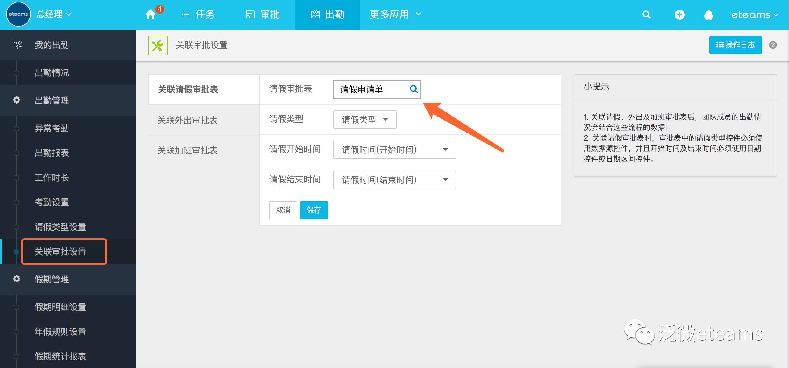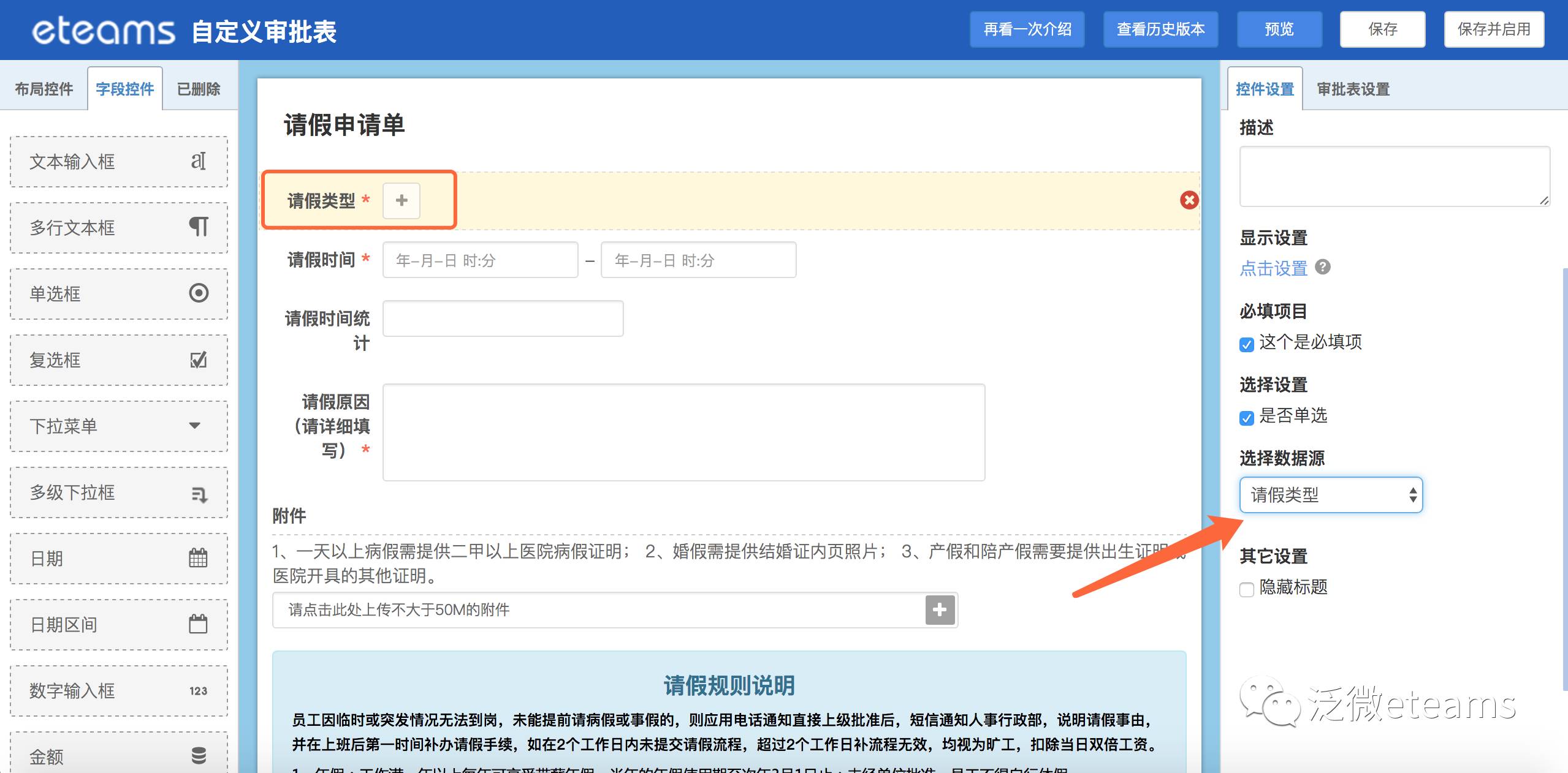 • 为了实现请假数据与考勤数据打通,请假类型应使用数据源控件;同时在出勤应用中将考勤设置关联请假审批