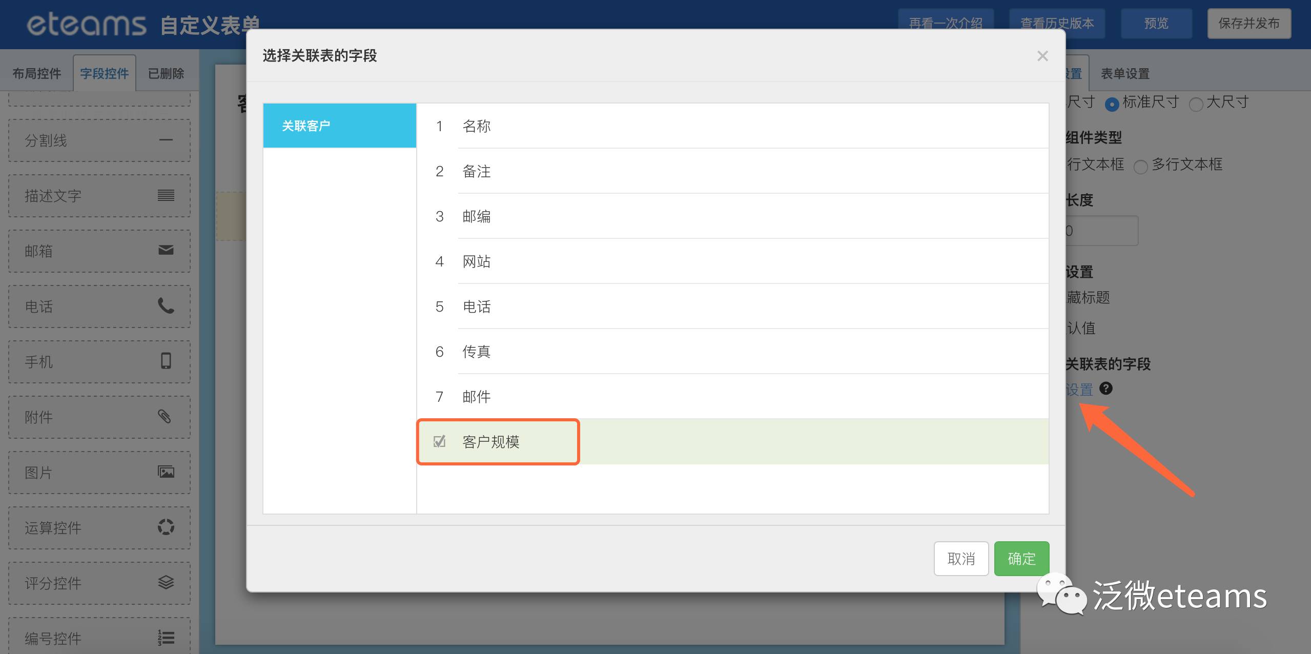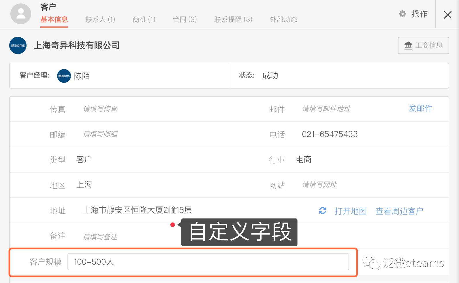CRM各应用模块的字段都支持自定义设置。以客户应用为例,除了系统自带的基础信息外,可能还需要对客户规模进行了解以便分类维护,通过创建自定义字段【客户规模】实现。而在具体的需要获取客户信息的场景中,使用自定义表单功能也支持关联钻取【客户规模】这一自定义字段信息了。
