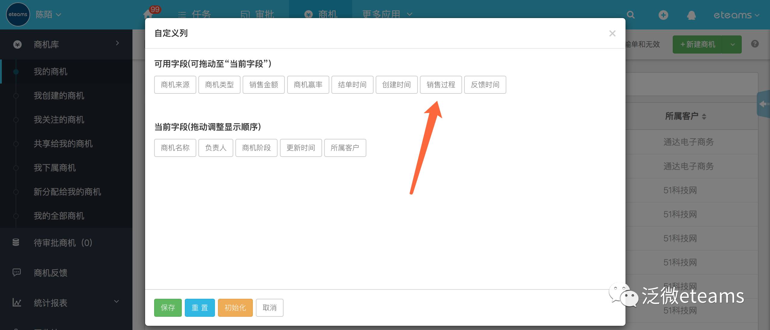 在商机应用中,可以通过自定义列功能来显示商机列表中快捷展示的商机信息,增加了【销售过程】的显示,同时,商机列表信息还支持按销售过程以此查看。