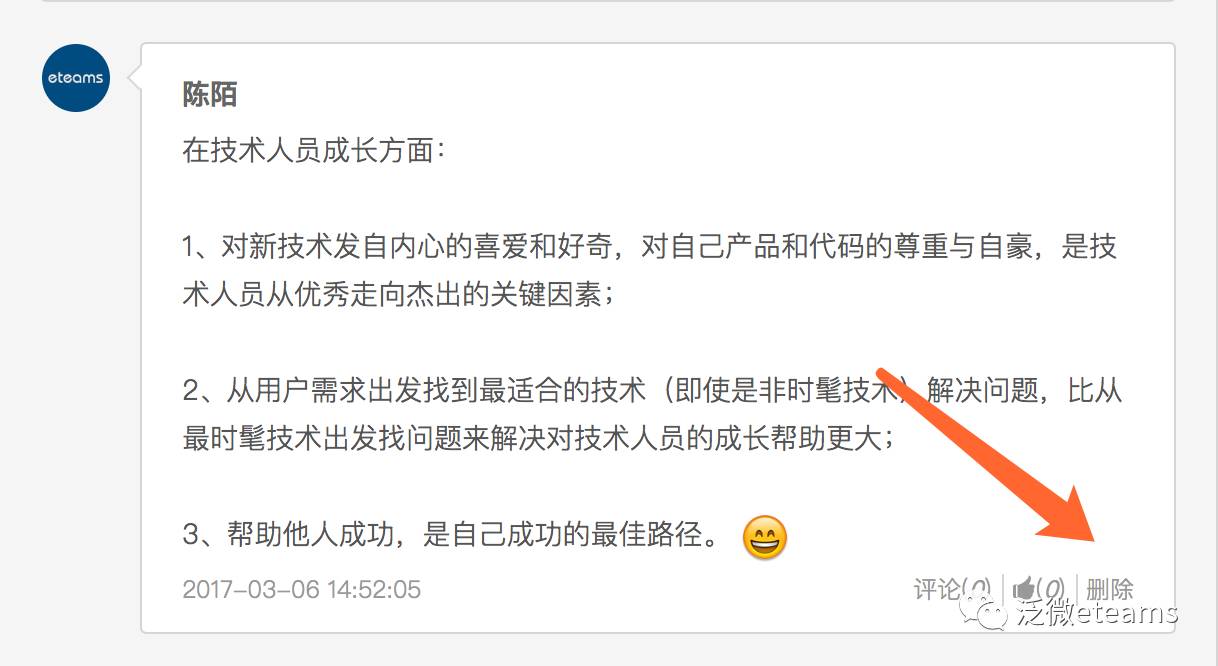 作为泛微eteams的“工作圈”,在团队分享中可以将工作中的总结、经验等各类信息进行快速分享给团队成员,当然也会出现分享错误的时候,可以进行快速删除,避免隐私泄露。