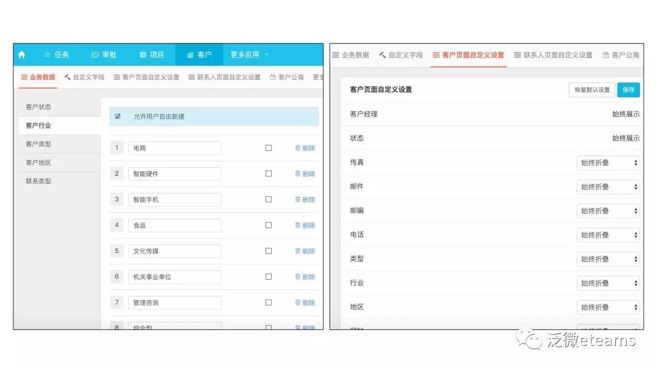 基本覆盖全模块应用的自定义字段功能,让每一项任务安排、每一个客户维护、每一次工作汇报等都满满的独家特色,拿重要的客户信息维护举例(其它的功能使用大致也是如此),系统提供了通用的信息字段,如传真、邮件、电话等,均可以自定义显示及显示方式设置,其中里面的一些重要业务数据还可以自定义维护和管理,如客户状态、行业等。