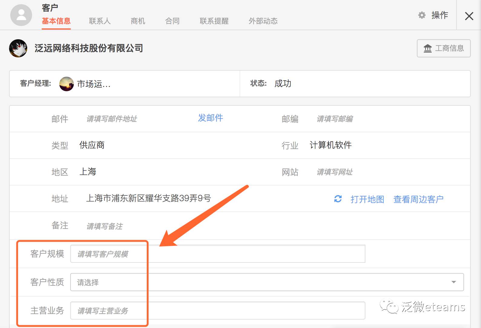除了通用信息字段还不够,我们可以使用各种表单控件组合来自定义客户字段,例如新增【客户规模】、【客户性质】等字段,甚至还可以根据客户的业务数据来显示,例如当【客户类型】为【供应商】时,显示【主营信息】;当客户类型为【合作商】是,显示【合作关系】。