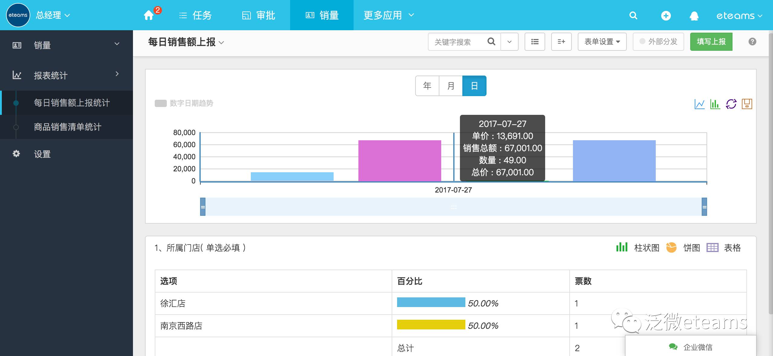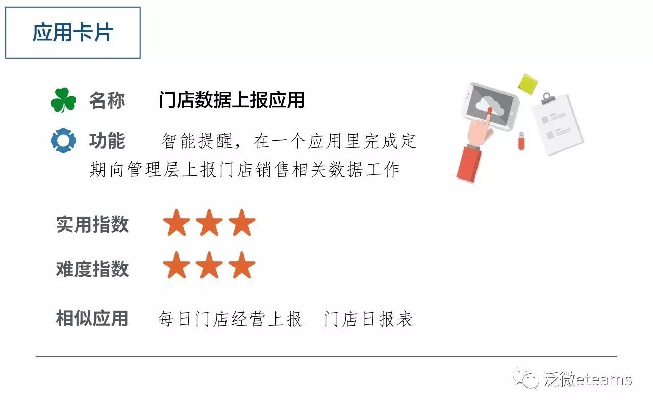 而通过eteams门店上报应用,定时在线收集各门店经营数据,还能多维度统计分析上报经营数据,形成规范化在线化的简易门店上报管理。