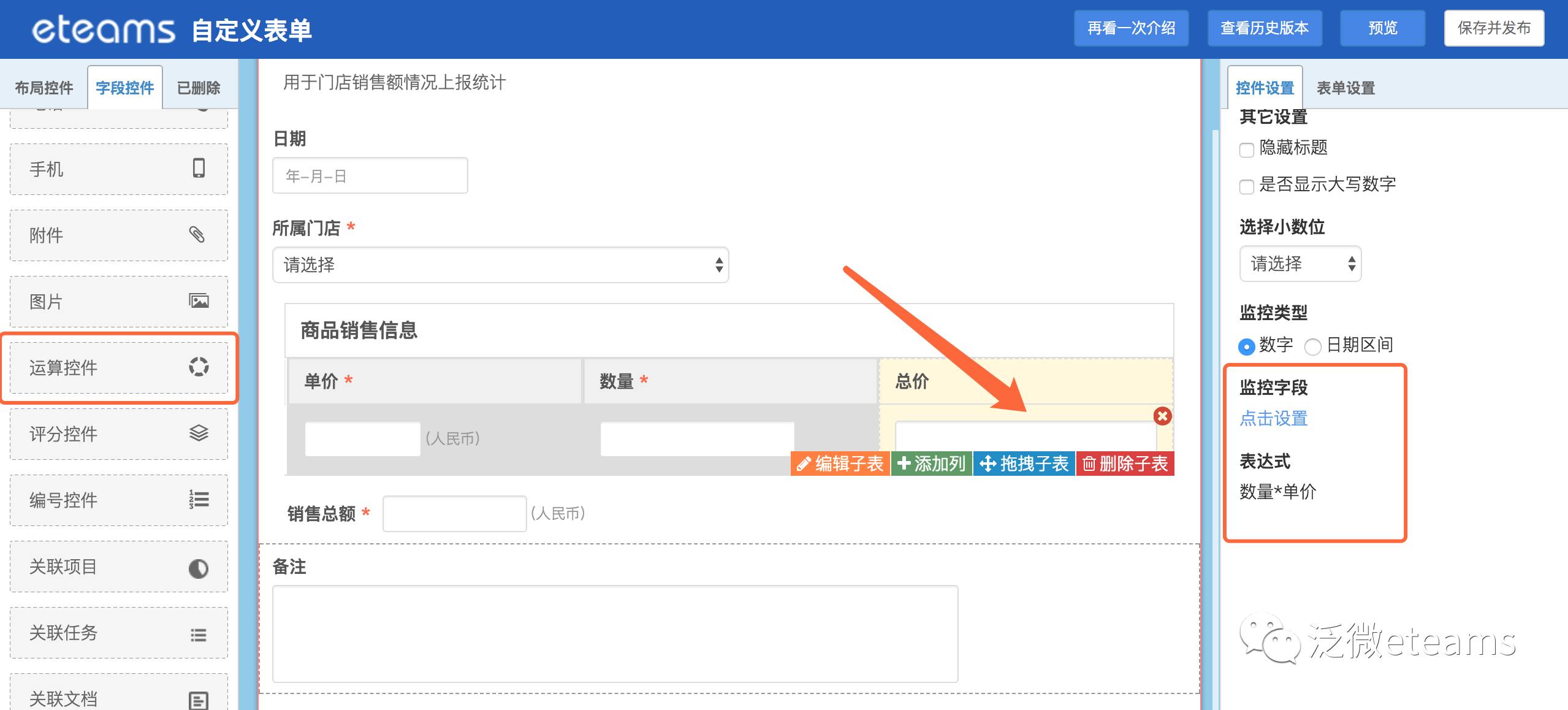 ●商品的销售总价使用运算控件,并设置相应的公式:总价=商品单价*数量,这样每次的销售额系统自动统计,通过明细字表还可以汇总所有商品的销售总额信息,十分方便