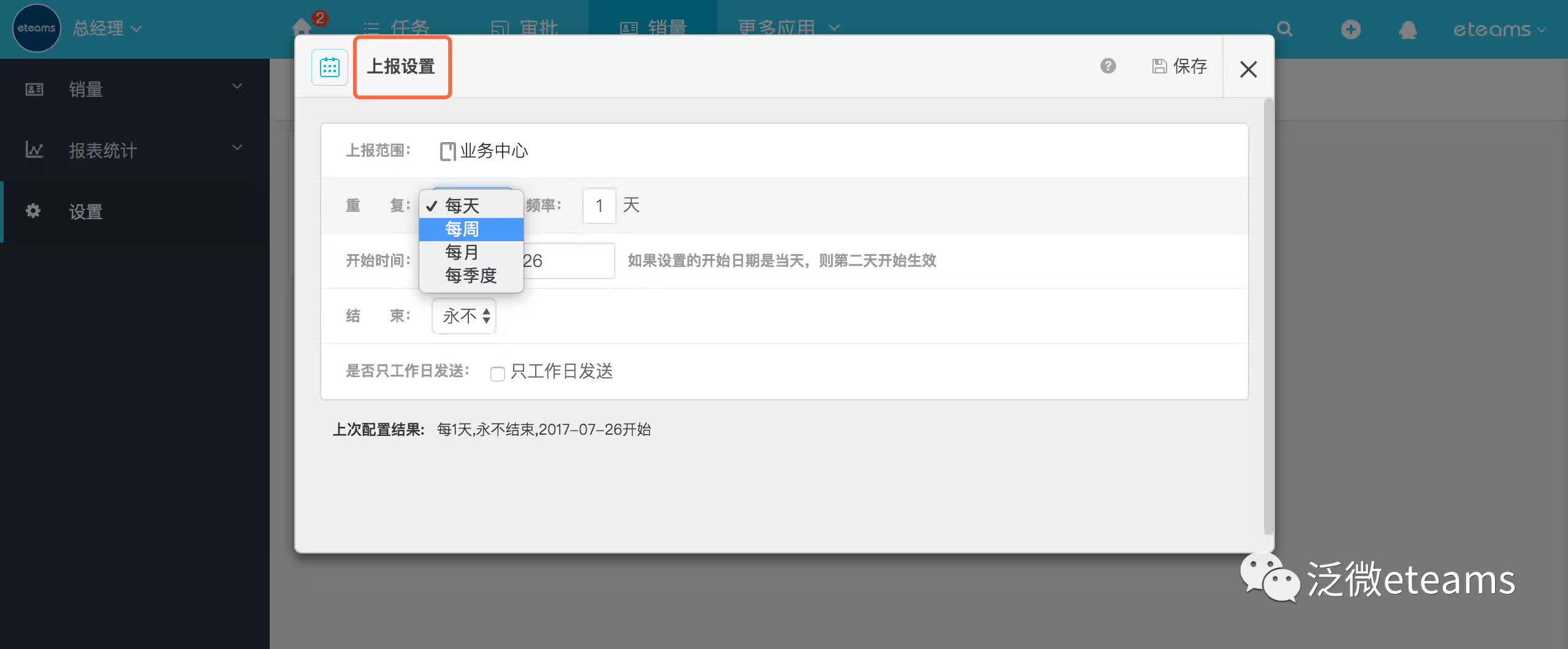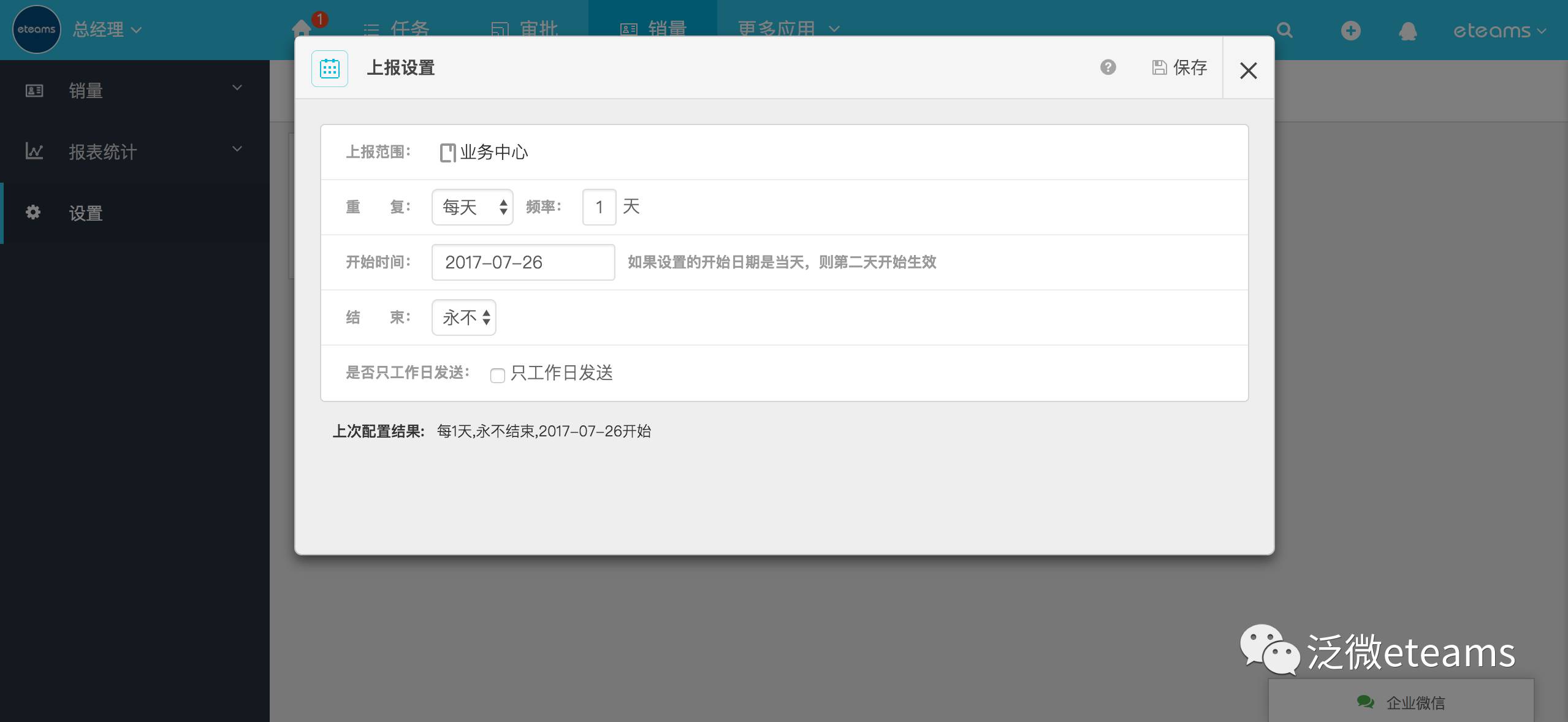 选择《每日销售额上报》表单,在【数据上报设置】中选择定时上报,这样就系统就自动定期代替提醒,无需人工干预。在上报中可以根据公司门店管理的时间要求设置相应的上报规则,如上报的人员部门范围、周期频次、有效期以及工作日等特殊情况设置等等。